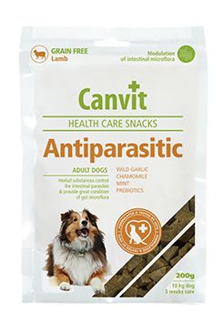 Masové pamlsky ve tvaru kostiček Canvit Antiparasitic se podávají nejen jako přirozená ochrana proti parazitům, ale také při akutních i chronických průjmech, po medikaci antibiotiky, po podání odčervení, při přechodu na nové krmivo a v dalších stresových situacích.