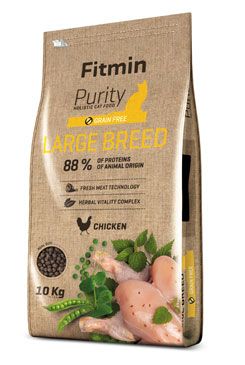 Kulinářský zážitek pro Vaši kočku. To je krmivo Fitmin cat Purity Large Breed. Jedná se o granule pro velké kočky, ve kterých najdete čerstvé kuřecí maso, bylinky na podporu vitality organismu, ovoce i zeleninu. Nejenže uspokojíte mlsné jazýčky Vašich koček, ale zároveň jim poskytnete prvotřídní kvalitu. Krmivo pro velké kočky Fitmin cat Purity Large Breed je tzv. Grainfree krmivo, to znamená, že neobsahuje obiloviny, je bezlepkové, čímž snižuje potencionální riziko výskytu alergických reakcí (např. na pšeničný lepek a kukuřičný gluten). Krmivo je svým unikátním složením a velikostí granule ideální pro kočky velkých plemen jako je Mainská Mývalí kočka, Ragdoll nebo norská lesní kočka. Krmivo Fitmin cat Purity Large Breed pro velké kočky je ve tvaru větší granule, kterou kočka musí rozkousnout. Díky krmivu bude kočka ve vynikající kondici, v neposlední řadě má krmivo důležitou detoxikační funkci díky bylinné směsi, která má ovšem i mnoho dalších blahodárných účinků. Granule pro velké kočky Fitmin cat Purity Large Breed jsou vyráběny nejmodernějšími technologiemi, jsou vyvážené, obsahují vysoký podíl živočišných složek a mnoho dalších benefitů - zejména komplex dentální péče, prebiotika, cheláty a další.