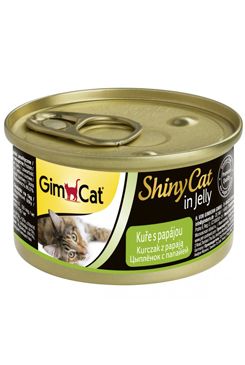 SHINY CAT - lahůdkové, čistě masové konzervy - pouze přírodní. V konzervě je vidět najemno nakrájené kuře a papája.