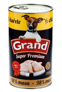 Konzerva Grand premium 1/2 celého kuřete je kompletní, prémiové krmivo pro psy, vytvořeno z čerstvého masa bez chemických přísad. Obsahuje vysoký podíl vitamínů a aminokyselin v přírodní formě. Neobsahuje žádné chemické ani konzervační přísady. Neobsahuje sóju. Do konzerv je přidávána rýžová mouka v maximální míře 0-2 % z důvodu zahuštění masové složky.