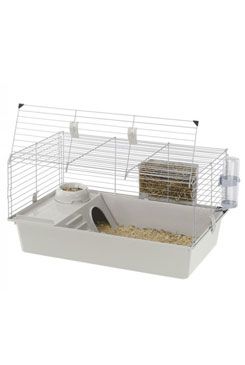 Klec pro morče s výbavou. Netoxický plast. S patrem sloužícím zároveň jako domeček, s miskou, která se upevňuje na patro a morčata s ní tak nemůžou pohybovat, napáječnou a krmítkem na seno.
