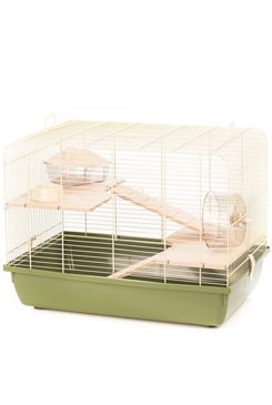 Součástí klece jsou dřevěná patra s rampu a plastové vybavení (domeček, kolotoč, miska).