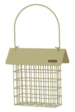 Závěsné kovové krmítko se stříškou, na lojové bloky.