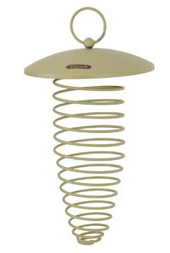 Závěsné kovové krmítko ve tvaru spirály, se stříškou, na lojové koule. Výška spirály 20cm. Dodáváno bez koulí.
