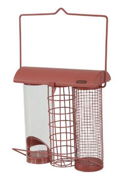 Závěsné venkovní kovové krmítko se stříškou a 3 samostatnými komorami na mix semen, lojové koule a slunečnicová semínka.