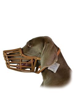 Náhubky pro psy z plastu s koženým řemínkem.