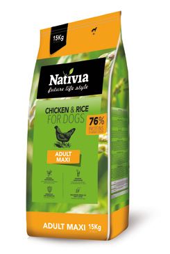 Receptura respektuje přirozené zákonitosti výživy psa. Obvyklá kombinace obilovin či brambor je zcela nahrazena pouze kvalitní rýží. Ta svojí stravitelností a profilem aminokyselin tyto tradiční suroviny převyšuje, nezatěžuje organismus a společně s ostatními komponentami výrobku zajistí zdravou výživu psa. Nativia Adult maxi v řadě Chicken&Rice obsahuje 76% bílkovin živočišného původu.