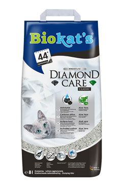 Podestýlka pro kočky od značky Biokat’s je vyrobena z čistě přírodního aktivního uhlí s obsahem Diamond Formula s černými a zelenými "diamanty". Biokat’s Diamond Care Classic pohlcuje pachy, výborně vsakuje a pochází ze skořápek kokosových ořechů. Díky výjimečným fyzikálně-chemickým vlastnostem aktivního uhlí dokáže stelivo Biokat’s Diamond Care Classic vázat neuvěřitelné množství pachů. Aloe vera zajišťuje podestýlce výjimečnou jemnost, tolik příjemnou pro kočičí tlapičky.